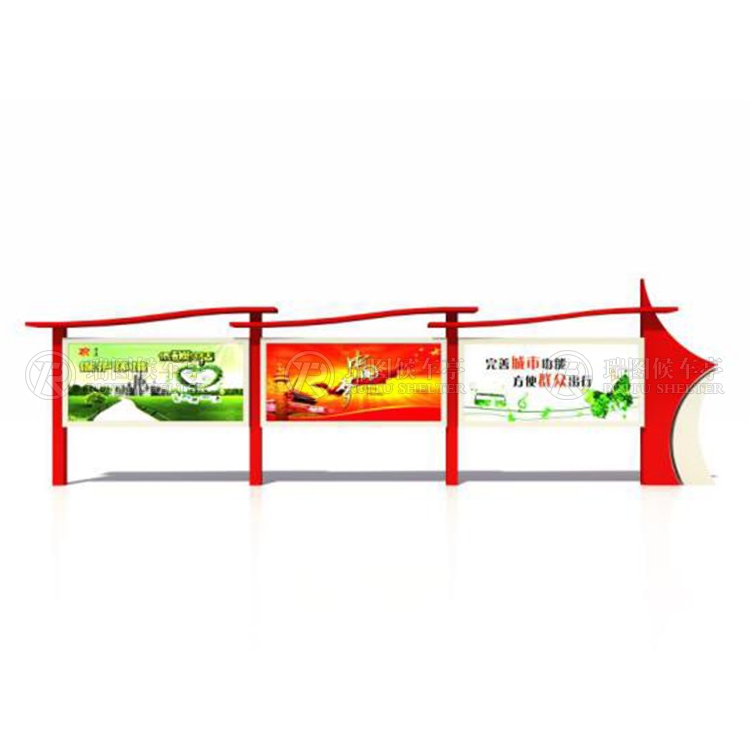 一般采用不銹鋼為框架,鋼化玻璃或者耐力板為面板,鋁合金為頂棚,面板可以打開更換宣傳畫面。